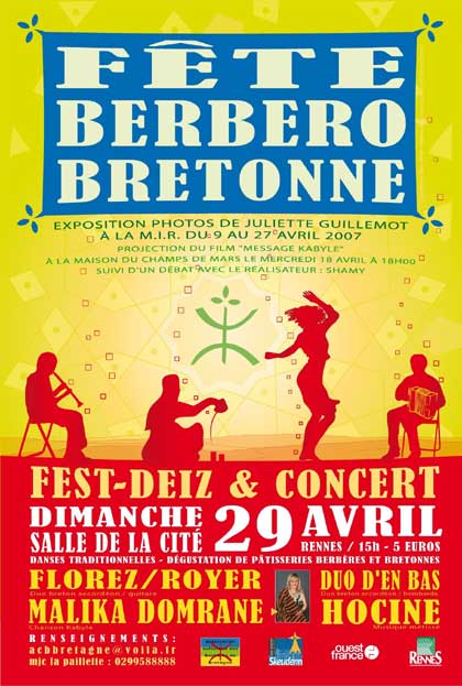L’association des Berbères de Bretagne, en partenariat avec Skeudenn [1], l’Union du pays rennais des associations culturelles bretonnes, organise une fête berbéro bretonne le 29 avril 2007 à Rennes.