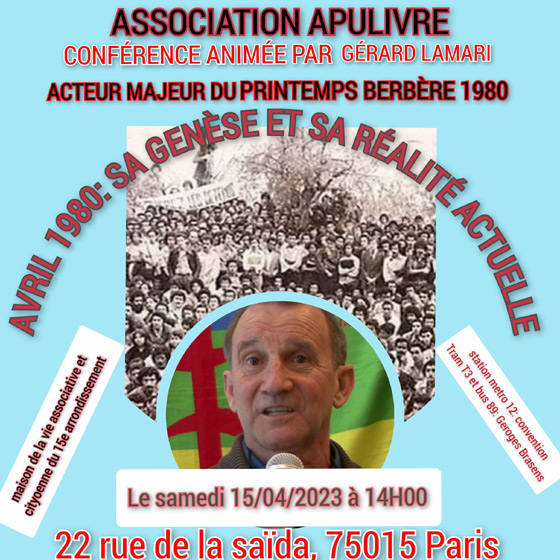Gérard Lamari, un des acteurs du Printemps berbère de 1980, anime une conférence organisée par APULIVRE le samedi 15 avril à Paris.