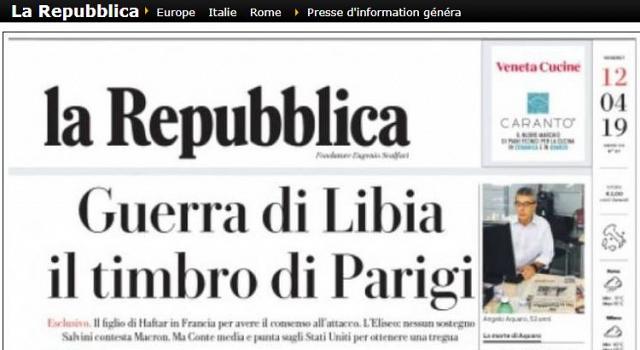 Le quotidien italien "La repubblica" affiche en Une de son édition du 12 avril 2019 un gros titre intitulé "Guerra di Libia, il timbro di Parigi" (Guerre de Libye, le sceau de Paris). Le journal rapporte que des hommes de Hafter se seraient rendus à Paris le 4 avril, le jour où le va-t-en-guerre de Benghazi a lancé son offensive sur Tripoli.