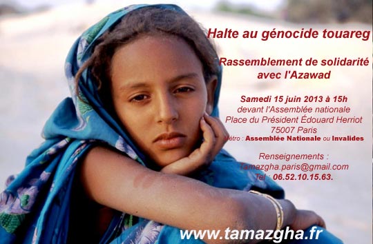 Tamazgha appelle à un rassemblement de solidarité avec l’Azawad et les Touaregs, le samedi 15 juin 2013 à 15h à Paris devant l’Assemblée nationale.