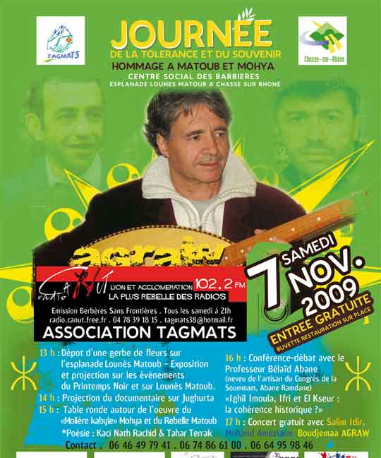 L’association Tagmatt (Chasse-sur-Rhône) organise une journée d’activités en hommage à Mohya et Matoub,deux personnalités qui ont marqué l’histoire récente de la Kabylie. Rendez-vous est donné le 7 novembre 2009 à partir de 13h.