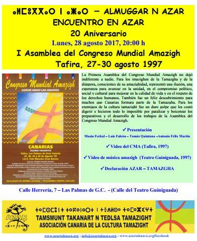 Pour marquer le vingtième anniversaire du congrès de Tafira, l’association AZAR organise une rencontre à Las Palmas le lundi 28 août 2017 à 20h, en présence de Masin Ferkal (président du CMA de 1995 à 1997), Luis Falcón (président du Comité d’organisation canarien du premier congrès du CMA), Tomás Quintana (membre du comité d’organisation canarien du premier congrès du CMA) et Antonio Martin Felix Hormiga (président du CMA élu en août 1997).