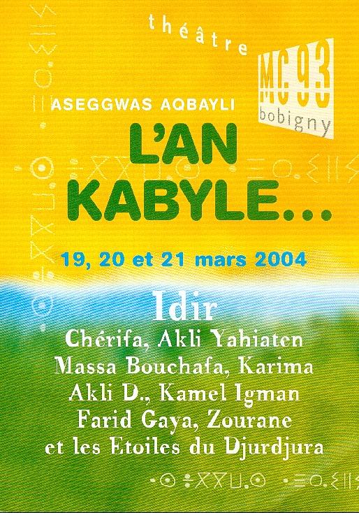 Voilà l’An kabyle qui s’annonce. En effet, La Maison de la Culture de Seine Saint-Denis (MC-93) a voulu mettre en avant la culture kabyle et les Berbères à travers une série d’activités autour de la musique, la poésie et le cinéma. Cette initiative est à encourager car émanant d’un organisme non compromis dans les élucubrations algéro-françaises. Initiative de ceux qui osent prendre les "chemins de travers"...