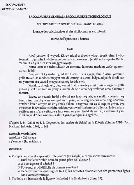 1. > L’épreuve de berbère au Bac : session 2006., 28 mars 2006, 21:35