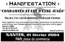 Pour dénoncer la détention arbitraire de détenus bretons, une manifestation aura lieu à Nantes (Loire Atlantique) ce samedi 21 février 2004. Cette manifestation est appelée par la Cooordination Anti-Répressive de Bretagne (CARB) et soutenue par plusieurs organisation et personnalités politiques et artistiques.