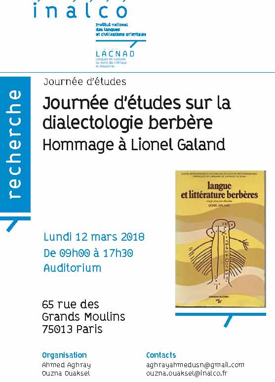Le centre de recherche berbère et le Lacnad, à l’Inalco, organisent, en hommage à Lionel Galand, une journée d’étude sur la dialectologie berbère et ses évolution, le lundi 12 mars 2018 qui aura lieu à l’Auditorium de l’Inalco (65, rue des Grands Moulins 75013 Paris).