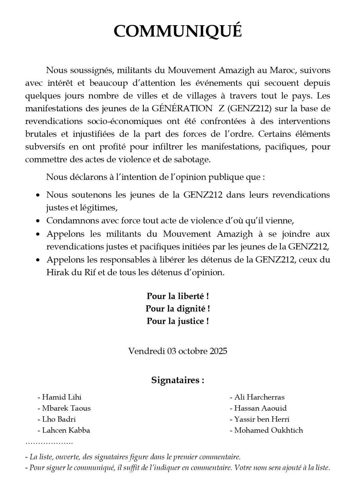 Nous saluons les militants du Mouvement amazigh qui, dans un communiqué en date du 3 octobre 2025, expriment leur soutien aux « jeunes de la GENZ212 dans leurs revendications légitimes » et appellent les militants du Mouvement amazigh à les soutenir et à se joindre à leurs « revendications justes et pacifiques ».