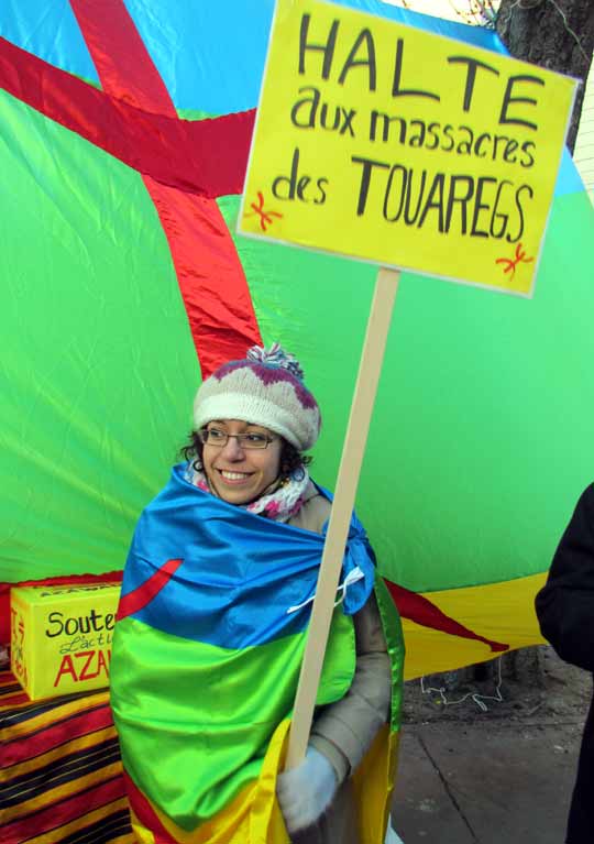 Quelques cent cinquante personnes ont défié le froid glacial de ce samedi 4 février à Paris et ont répondu à l’appel de Tamazgha pour exprimer leur soutien au combat de libération de l’Azawad. Ainsi, la Place Édouard Herriot devant l’Assemblée nationale à Paris était aux couleurs amazighes avec le géant drapeau amazigh et un drapeau de l’Azawad libre. Plusieurs banderoles ont été déployées sur la place. On pouvait ainsi lire : "Halte au génocide des Touaregs !", "Tanekra dagh temoust " en tifinagh ou encore "Pour la libération de l’Azawad – Tilelli i Azawad". Des manifestants portaient également des pancartes dénonçant l’État malien ou qui demandent la liberté à l’Azawad ("Mali = AQMI – Azawad = Liberté", "Halte aux massacres des Touaregs !", "Azawad libre", etc.).