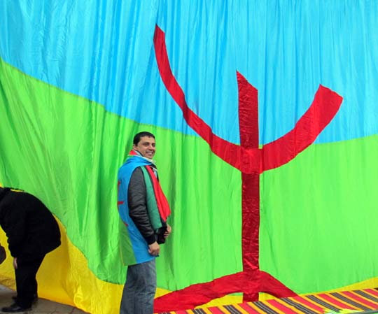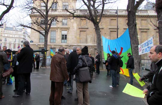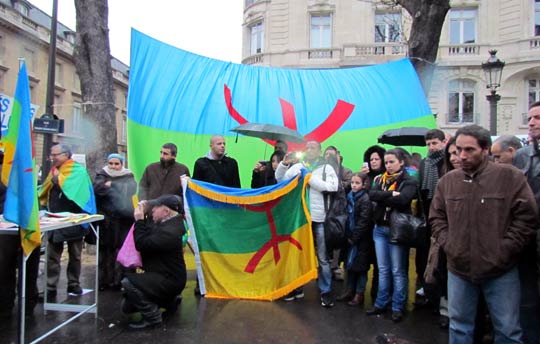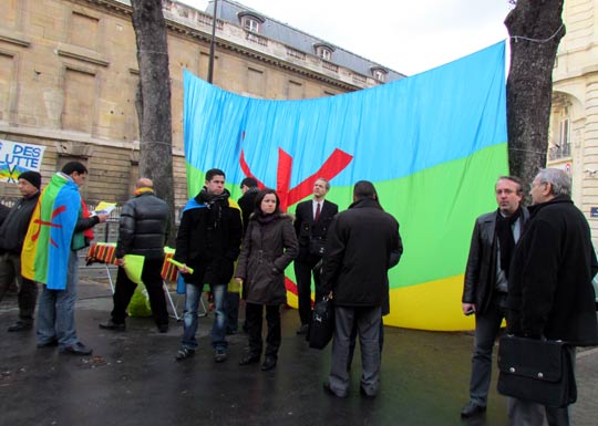 Le ciel était gris et bien chargé et la température ne dépassait pas les 6 – 7°C ce samedi 17 décembre 2011 à Paris. La Place Édouard Herriot dans le 7ème arrondissement, devant l’Assemblée nationale, va à partir de 14h petit à petit s’habiller de couleurs venant contraster avec le gris du ciel. Le bleu, le vert, le jaune et le rouge du géant drapeau Amazigh (berbère) a donné à cette place quelque chaleur… La place ne tardera pas à se remplir de nombreuses personnes et personnalités venues témoigner leur soutien aux Amazighs de Libye en lutte.