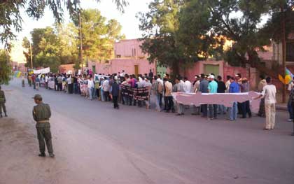 Parmi les villes qui ont vu des militants amazighs sortir dans la rue, il y a Imteghren [1]. Des militants indépendants ont sillonné les rues de la ville pendant plus de deux heures (de 16h00 à 18h30) en scandant des slogans qui réclament l’officialisation de tamazight tel "tamazight nationale, elle sera officielle". Bien qu’encerclés par un arsenal important des forces d’oppression, les jeunes amazighs d’Imteghren et la région ont fustigé le pouvoir marocain en l’accusant d’être le responsable des malheurs qui frappent Imazighen. Ainsi, ont-ils, par exemple, scandé "A lmexzen a bu tillas, baraka n tkerkas" (= pouvoir obscurantiste, y en a marre des mensonges).
