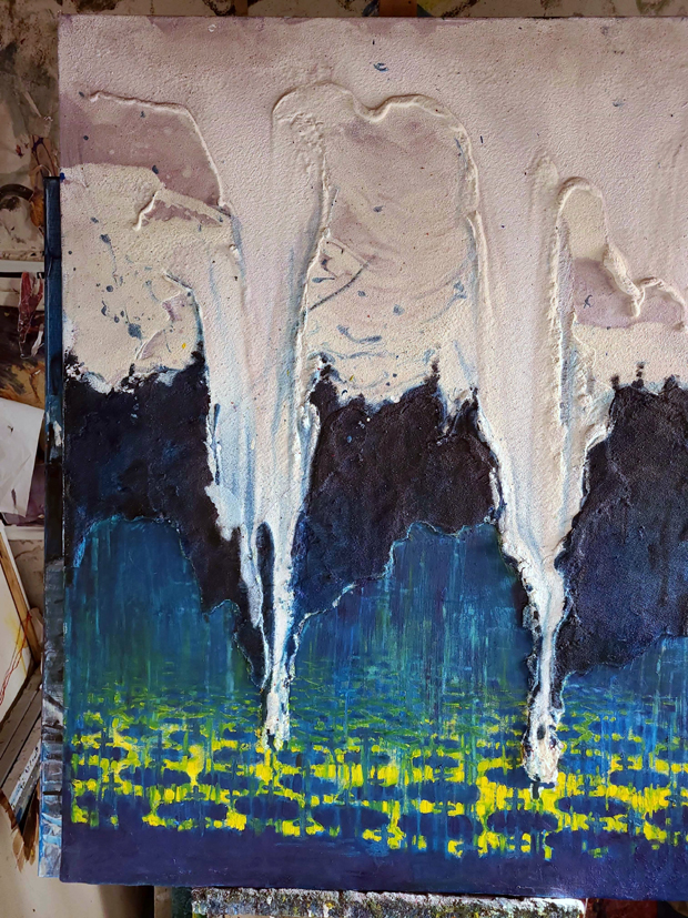 Ils se déchaussent, se déshabillent. Des dizaines de milliers de pieds nus, écorchés par les épines, épuisés et ensanglantés, foulent le sable chaud. Il devient rouge sang. Les pieds malaxent le sable, le mélangent avec les habits de différentes couleurs, l’étalent sur l’eau salée de la Méditerranée, provoquant une tempête.