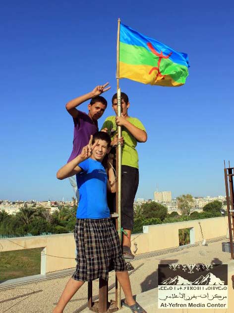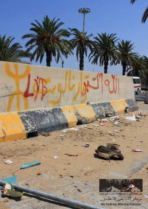 Aussitôt Tripoli libérée, le drapeau amazigh est apparu un peu partout dans les quartiers de Tripoli notamment au centre de la ville. Même la résidence du despote a eu droit à un drapeau sur son toit.