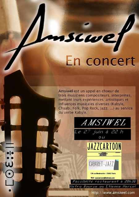 Le groupe de musique kabyle Amsiwel sera en concert au Jazzcartoon à Paris le vendredi 27 juin 2008 à 22h00.