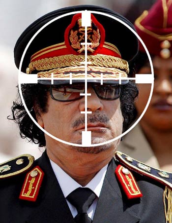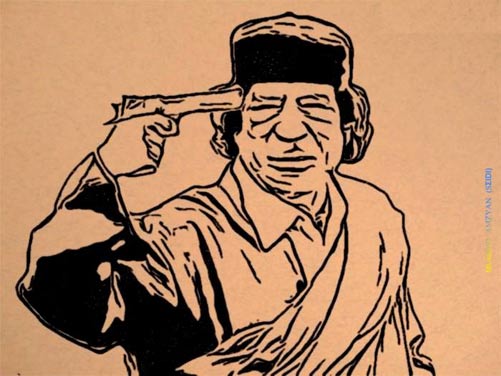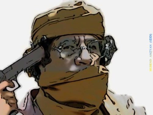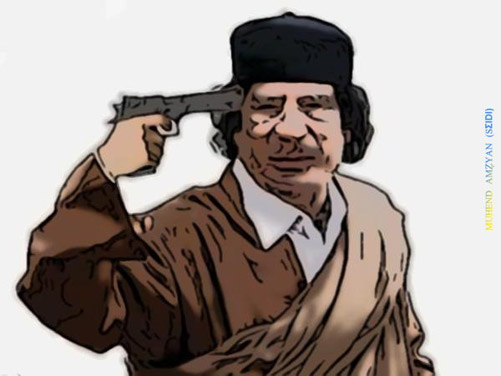 Il a menacé ses opposants en Libye de les exterminer, de les pourchasser partout en Libye, maison par maison, ruelle par ruelle. Il les a traités de tous les noms (rats, mercenaires, drogués, traitres à la solde des ennemis, etc.). Il a appelé à l’éradication des Imazighen. Il a usé de toutes les armes dont il dispose (que, par ailleurs, l’Occident lui a vendues) pour venir à bout des insurgés. Suite à l’adoption de la Résolution 1973 par le Conseil de sécurité des Nations Unies, il a défié la France, la Grande Bretagne, les Etast-Unis d’Amérique, l’OTAN.