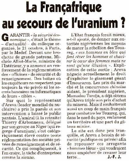 AREVA et anti-AREVA Niger vont-ils réussir à trouver un terrain d’entente sur terres touarègues ? En effet, les propos de l’Amiral ressemblent curieusement à ceux tenus par un certain Nouhou Arzika, l’un des chefs de file des "anti-Areva" au Niger, qui veut aussi croire à la fin des hostilités en souhaitant que "Areva et la France soutiennent" le Niger pour mater la rébellion touareg (AFP14/01/08).