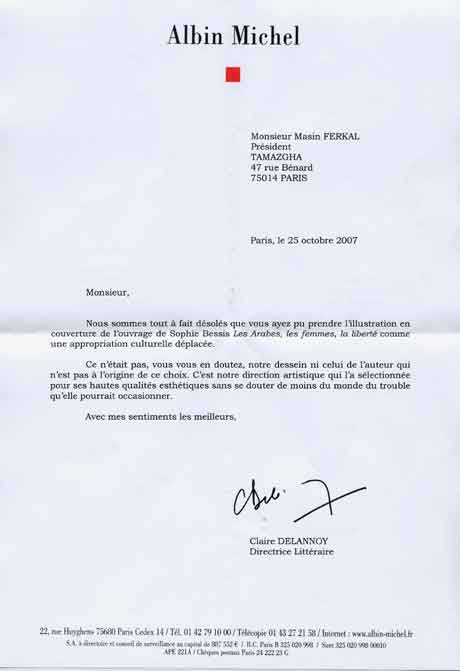 La Directrice Littéraire des éditions Albin Michel, Claire Delannoy, répond au courrier que les adhérents de Tamazgha ont adressé aux éditions Albin Michel à propos de l’ouvrage de Sophie Bessis intitulé Les Arabes, les femmes, le liberté. Pour rappel, la première page de couverture de ce dernier est illustrée par un bijou kabyle, ce qui a scandalisé les adhérents de Tamazgha qui n’ont donc pas manqué de réagir auprès de l’éditeur de l’ouvrage.