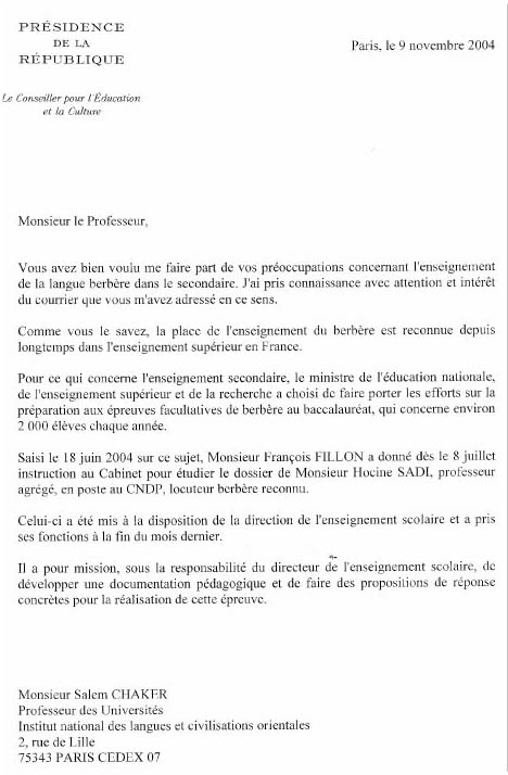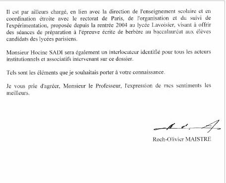 Nous publions, ci-après, la lettre de Roch-Olivier Maistre, conseiller à l’éducation auprès de Jacques Chirac, adressée à Salem Chaker au sujet de l’enseignement de la langue berbère en France.