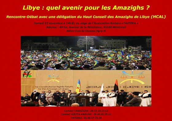 De toutes ces questions et de la situation précaire que traverse la Libye aujourd’hui qui, par ailleurs, ne facilite certes pas les choses aux Amazighs, nous aurons à échanger avec la délégation du HCAL ce samedi 22 novembre 2014 à Paris.