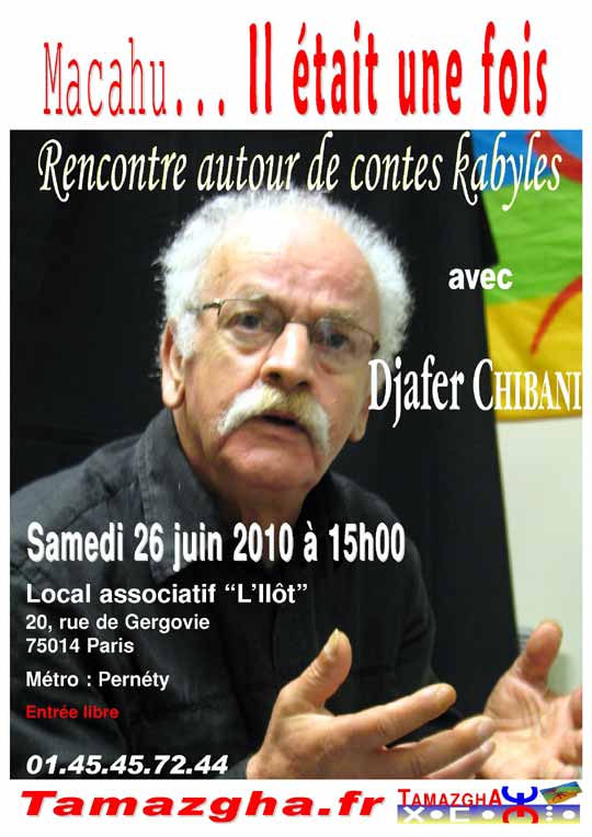 Tamazgha organise une rencontre autour de contes kabyles avec Djafer Chibani, le samedi 26 juin 2010 à 15h à Paris.