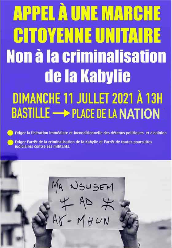 Ceux qui appellent à la marche du 11 juillet tiennent à affirmer leur soutien et leur solidarité « sans faille avec les détenus politiques gravement menacés par le scélérat article 87 bis et avec tous les détenus qui subissent de plein fouet la répression féroce du système algérien ». Il appellent ainsi à « une marche citoyenne unitaire le dimanche 11 Juillet, à Paris, de Bastille à Nation, à partir de 13h » pour exiger « la libération immédiate et inconditionnelle des détenus politiques et d’opinion » ainsi que « l’arrêt de la criminalisation de la Kabylie et l’arrêt de toutes poursuites judiciaires contre ses militants ». Ils estiment que « la Kabylie est en danger et nous n’avons pas le droit d’abandonner ceux qui défendent nos libertés ».