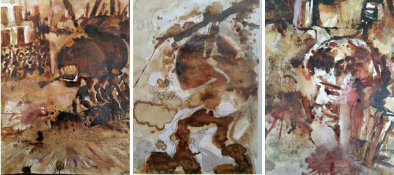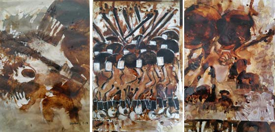 D’énormes casques noirs dominent les tableaux peints avec un mélange de café et de vin rouge. Ils sont portés par des êtres en bottes, armés de puissants gourdins. Barbares aux noirs desseins. Des militaires haineux prêts à opprimer, à violer et à torturer. Ils sèment la peur et la répression. Face à eux, des manifestants, minuscules et lointains. Sur les tableaux, les militaires ressemblent à des Fourmies géantes prêtes à en découdre. Du sang perle de leurs bouches ouvertes, similaires à celles de zombies. Elles suintent. « C’est pour laisser comprendre qu’il s’agit d’une invasion du Rif », me dit-il.
