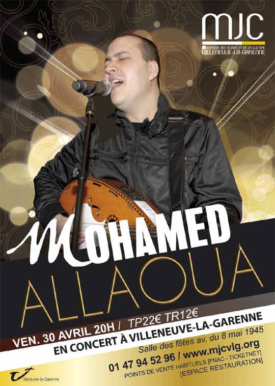 La Maison des Jeunes et de la Culture de Villeneuve-la-Garenne (Hauts de Seine) organise un concert avec le chanteur kabyle Mohand ALLAOUA, le vendredi 30 avril 2010 à 20h à la Salle des Fêtes de Villeneuve-la-Garenne (12-20, avenue du 8 Mai 1945).