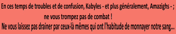 En ces temps de troubles et de confusion, Kabyles - et plus généralement, Amazighs - ; ne vous trompez pas de combat ! Ne vous laissez pas drainer par ceux-là mêmes qui ont l’habitude de monnayer notre sang...