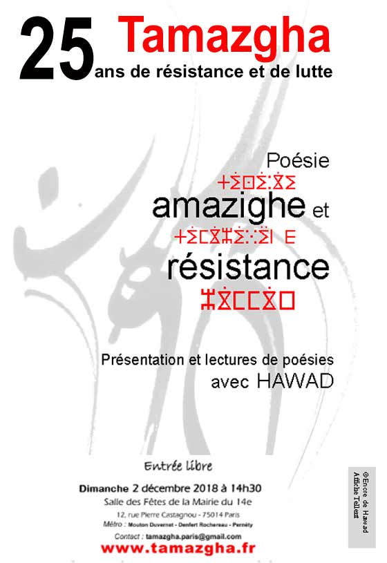 Pour ses vingt-cinq ans, Tamazgha organise une rencontre autour de la poésie avec Hawad, à Paris le 2 décembre 2018. Hawad, poète et peintre amajagh (touareg), met en scène des mondes "infiniment en marche" qui se rencontrent, se métamorphosent, se recomposent pour continuer leur route. Le drame et la résistance du peuple touareg ou de tout peuple menacé d’extermination émaillent son univers de fiction. Son dernier ouvrage, Furigraphie – Poésie 1985-2015, est paru chez Gallimard/Poésie en 2017.