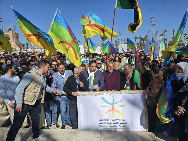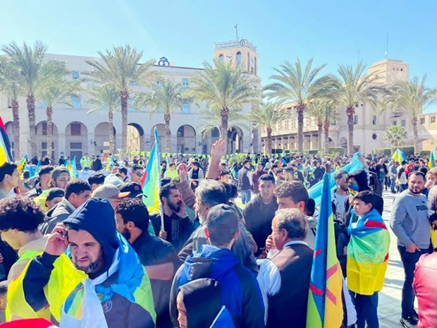 Une grande manifestation pacifique a eu lieu à la Place des Martyrs à Tripoli le mercredi 26 février pour dénoncer la profanation du drapeau amazigh, la multiplication des provocations visant les Amazighs notamment de la part de Trabelsi Imad, faisant fonction de ministre de l’Intérieur, qui alimente la haine et l’hostilité envers les Amazighs. Dans leur déclaration, lue par le président du Haut conseil des Amazighs de Libye (HCAL), les représentants des régions amazighes venus manifester à Tripoli ont tenu à réaffirmer leur condamnation de l’incident de profanation du drapeau amazigh ainsi que le silence des institutions étatiques. Ils exigent l’arrestation des coupables et demandent la démission du faisant fonction de ministre de l’Intérieur ainsi que du chef de la sécurité publique. Le lendemain, jeudi 27 février, un rassemblement s’est tenu devant le siège de la Mission d’appui des Nations Unies en Libye (MANUL) à Tripoli et les représentants du Mouvement amazigh ont remis à Hanna Serwaa Tetteh, représentante spéciale et Cheffe de la MANUL, une note de protestation dans laquelle ont été exposées diverses questions. Les représentants des Amazighs ont sollicité son soutien face aux attaques officielles et à la marginalisation qui les visent. La représentante des Nations unies en Libye a été priée d’user de ses pouvoirs afin d’interpeler les autorités libyennes pour prendre en considération les Amazighs et leurs droits dans le but de préserver la paix civile et la stabilité politique.