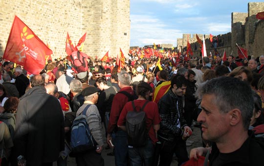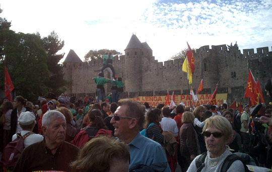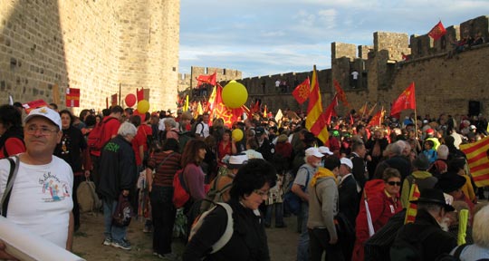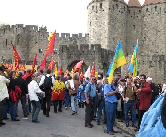 La "Coordinacion Anem Òc !", composée de plusieurs organisations (Institut d’Estudis Occitans [1], F.E.L.C.O. [2], Calandreta [3], Òc-Bi [4] et Felibrige [5]) a appelé à une manifestation le 24 octobre, à Carcassonne, pour demander la reconnaissance de la langue occitane et une prise en charge plus conséquente de cette langue par l’Etat français. La manifestation a été un véritable succès dans la mesure où l’essentiel des forces vives de la mouvance occitane ont répondu à l’appel, et près de 25.000 personnes ont convergé vers la cité occitane de Carcassonne ce samedi 24 octobre.