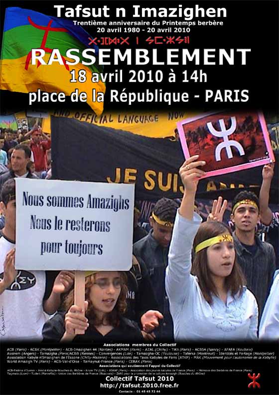 Plus d’une trentaine d’associations amazighes à travers l’Hexagone appellent à un rassemblement le dimanche 18 avril 2010 à 14h00 à Place de la République à Paris. C’est pour marquer le trentième anniversaire du Printemps berbère.