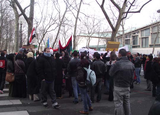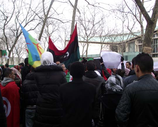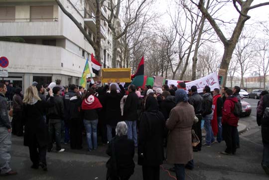Ce mardi 22 février 2011, un rassemblement de jeunes étudiants libyens devant la représentation diplomatique du régime de Kdhafi à Paris a été dispersée par la police. Les jeunes manifestants ont été brutalement délogés devant l’ambassade. Il ont finalement pu se rassembler à une cinquantaine de mètres plus loin rejoints par d’autres manifestants.