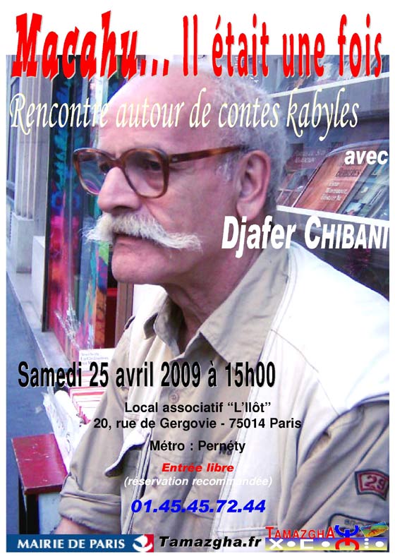 La rencontre sera animée par Djafer Chibani, conteur et comédien kabyle. Elle aura lieu au local associatif L’ Ilôt (20, rue Gergovie - 75014 Paris).