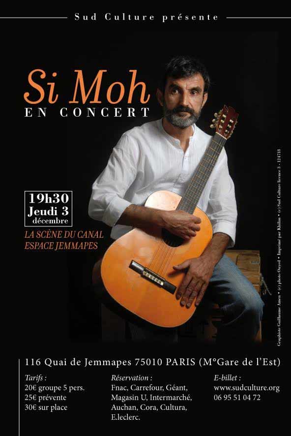 Le jeudi 3 décembre 2015, à 19h30, l’artiste kabyle Si Moh se produit à La scène du Canal - Espace Jemmapes à Paris.