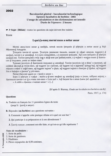 Accueil > Dossiers et documents > Berbère au Bac > Rifain (Tarifit) > Sujet-2002-Rifain