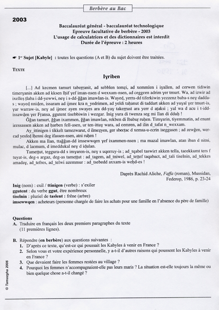 Accueil > Dossiers et documents > Berbère au Bac > Kabyle (Taqbaylit) > Sujet-2003-Kabyle
