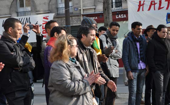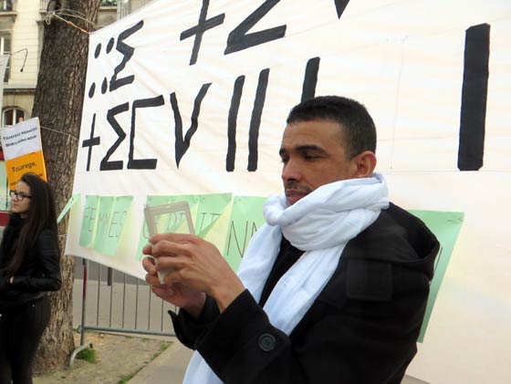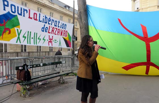 Masin Ferkal, représentant Tamazgha, prend la parole pour rappeler que ce rassemblement a été voulu pour exprimer la solidarité avec les Touaregs qui se battent dans l’Azawad contre l’oppression, l’injustice, la dictature et cette alliance internationale qui veut absolument anéantir l’Amazighité et le Touareg. Après avoir faire un bref rappel de la longue lutte des Touaregs qui remonte notamment au départ du colonialisme français en 1960 qui avait décidé d’annexer les Touaregs à des Etats créés de toute pièce par la France, il revient sur les derniers pourparlers entre les mouvements de l’Azawad et le Mali qui ont abouti à la mascarade d’Alger du 1er mars 2015. Laquelle mascarade, précise-t-il est rejetée par l’ensemble des populations de l’Azawad. Il a rappelé que les populations de l’Azawad, et en première ligne la femme, ne cessent de marteler depuis fin février qu’elles ne veulent que l’indépendance, rien que l’indépendance de l’Azawad. Il a dénoncé les pressions de la communauté internationale, à sa tête la France, sur les Mouvements de l’Azawad afin qu’ils signent les accords concoctés par Alger. Au passage, il dénonce l’attitude des autorités françaises qui ont refusé de délivrer un visa un une dirigeante du MNLA qui tenait à faire le déplacement pour participer au rassemblement de Paris. Il assure que Tamazgha s’inscrit dans une seule voie, celle de la lutte pour l’indépendance de l’Azawad. Même s’il faut s’attendre à de violentes réactions de la part des ennemis de cette indépendance. A ce sujet, il met en garde la communauté internationale quant aux exactions qui risquent de viser les populations civiles de l’Azawad en représailles à la non-signature des accords par les mouvements de l’Azawad. La communauté internationale, la France en particulier, doivent faire attention à ce que les exactions auxquelles sont habitués les Azawadiens ne se répètent pas. Il appelle la France à avoir un œil sur ce que fait Alger dans la région, car, selon lui, l’Etat algérien n’hésitera pas à réactiver ses réseaux terroristes-islamistes dans l’Azawad, ces islamistes qu’Alger se donne le droit de faire agir dans l’Azawad pour punir les Touaregs. La France ne doit pas cautionner le projet criminel de l’Etat algérien dans l’Azawad pour lequel tous les moyens sont bons pour saboter le projet indépendantiste de l’Azawad et afin d’associer le combat de l’Azawad au terrorisme islamiste. "Nous tenons à assurer nos frères Touaregs qui se battent dans l’Azawad pour leur indépendance et pour leur liberté que nous irons jusqu’au bout avec eux. Tant que le combat est un combat pour la liberté, pour la dignité, on sera là et on fera tout ! Et on fera tout pour faire entendre la voix de l’Azawad, la voix de la liberté, la voix de la dignité". Il a tenu, au nom de Tamazgha, à rendre un hommage particulier aux braves femmes touarègues qui n’ont pas cessé de se battre et se mettre en première ligne depuis janvier 2012. "Soyons solidaires de ce qui se passe dans l’Azawad. Soyons attentifs à ce qui se passera dans les jours qui viennent et restons mobilisés et prêts pour dénoncer toute atteinte aux droits des Azawadiens." a-t-il conclu.