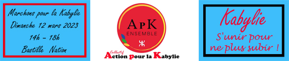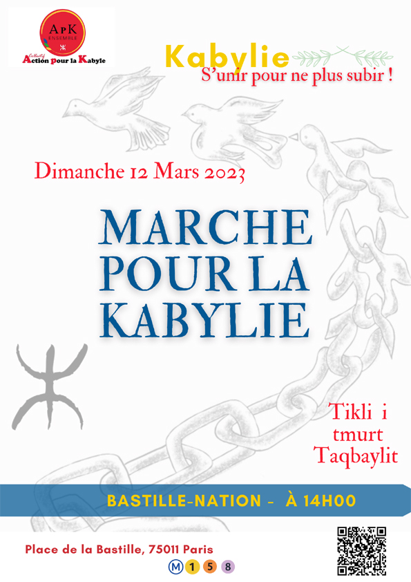 C’est dans ce contexte qu’un collectif soucieux de défendre les intérêts moraux et matériels de la Kabylie s’est formé en France, il appelle à une marche à Paris le 12 mars 2023 à 14h, de Bastille à Nation, pour agir en faveur de la Kabylie meurtrie et menacée. Ce collectif et son initiative doivent être soutenus et accompagnés.