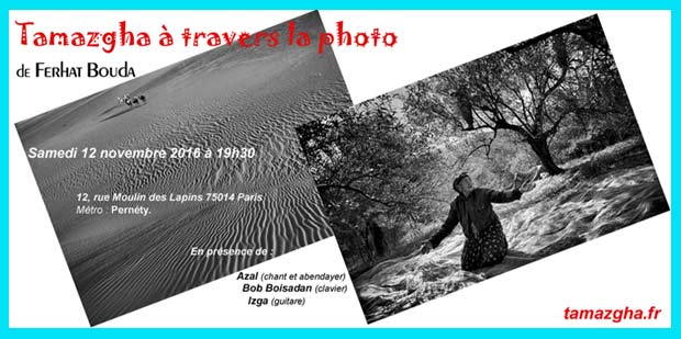 Le samedi 12 novembre, et à l’occasion du Paris Photo, un événement international, Ferhat Bouda présentera une sélection non exhaustive de ses clichés pris au fil de ses voyages en Terre amazighe. Le diaporama de cette sélection qui sera projeté sera accompagné par les chants et la musique de trois artistes : Bob Boisadan (clavier), Izga (guitare) et Azal (chant et abendayer).