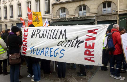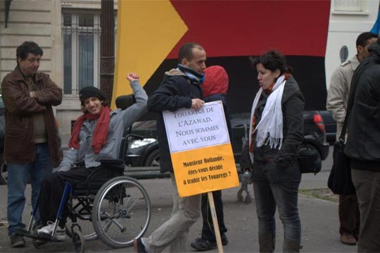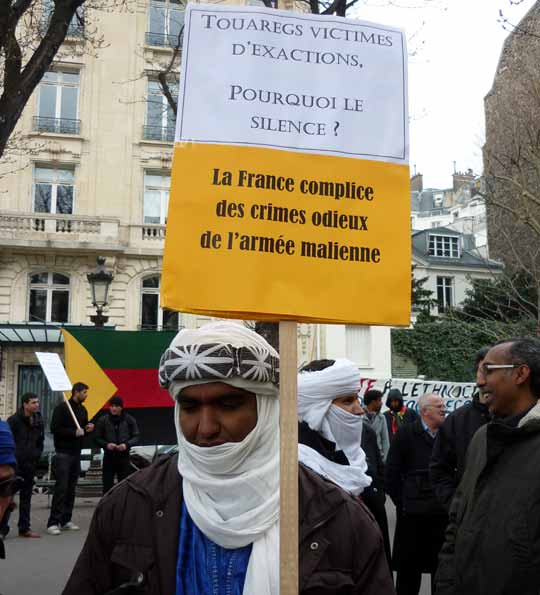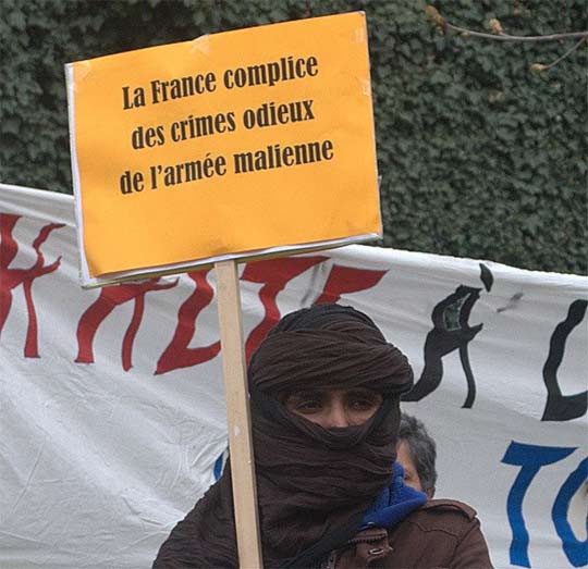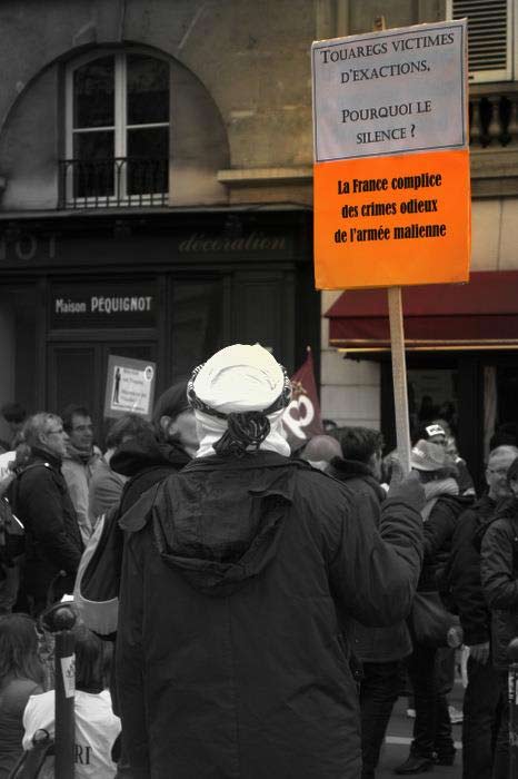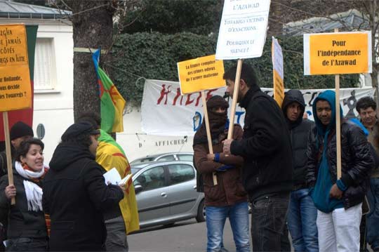 Sur nombre de banderoles et autres pancartes on pouvait lire : "La France complice des bourreaux de l’Azawad", "France-Areva : Uranium contre Touaregs", "La France complice des crimes odieux de l’armée malienne", "Touaregs de l’Azawad, Tamazgha est avec vous" ou encore "Terroristes islamistes, Armée malienne, même combat !".