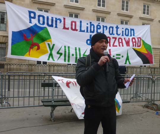 Masin Ferkal, quant à lui, est revenu dans son intervention sur le fait historique majeur qu’a constitué la proclamation de l’indépendance de l’Azawad par le MNLA un an, jour pour jour, auparavant. Il a rappelé l’engagement de Tamazgha aux côtés des Touaregs et de tous les Amazighs qui se battent pour que ce peuple recouvre sa souveraineté sur son territoire. Il a dénoncé la position de la France par rapport à l’Azawad et a fustigé Laurent Fabius qui est allé à Bamako demander au MNLA de se déramer et d’accepter le cantonnement au sein de l’armée malienne. Face à cet acharnement de la France sur les Touaregs et Imazighen de manière générale, il estime que les Amazighs se doivent de revoir leur attitude vis-à-vis de la France qui est l’allié inconditionnel de l’ensemble des régimes qui dominent sur le pays amazigh et qui ont programmé l’éradication de l’amazighité de l’Afrique du Nord. Il a demandé aux personnes présentes de persévérer dans leur mobilisation pour l’Azawad et a assuré que Tamazgha ira jusqu’au bout dans son combat aux côtés des Azawadiennes et Azawadiens qui se battent pour leurs liberté et dignité.
