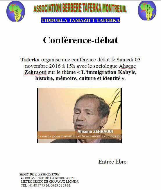 L’association Taferka organise une conférence avec le sociologue Ahcène Zehraoui, le samedi 5 novembre 2016 à 15h à Montreuil sur l’immigration Kabyle en France.
