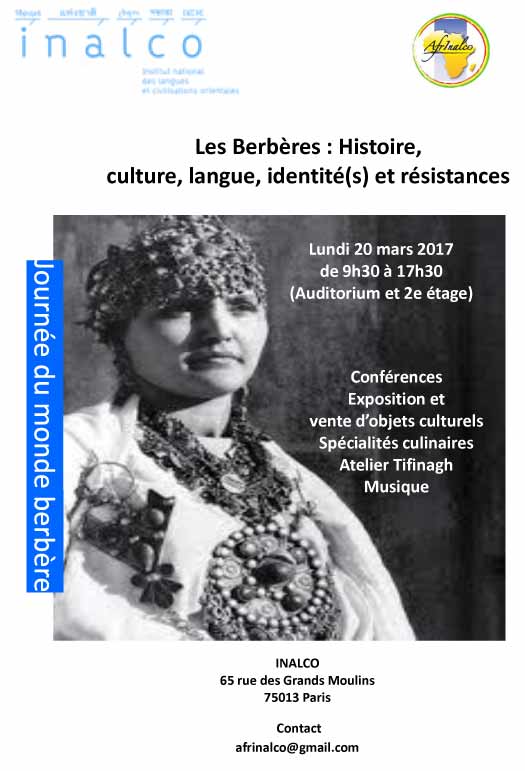 Des étudiants de la section berbère à l’Inalco organisent une journée "monde berbère" intitulée "Les Berbères : Histoire, culture, langue, identité(s) et résistances", le lundi 20 mars 2017 au PLC-Inalco (65, rue des Grands Moulins - Paris 13e).