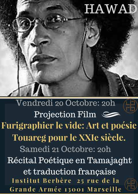 - Samedi 21 octobre 2017 : Récital de poésie de Hawad en tamajaght, accompagné de la traduction française