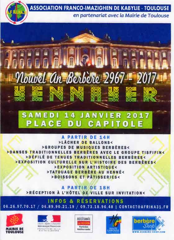 Yennayer sera célébré en terre occitane le 14 janvier 2017. Et c’est la Place du Capitol, de la ville rose, Toulouse, qui sera aux couleurs berbères ce 14 janvier avec un programme concocté par l’Association franco-imazighen de Kabylie à Toulouse (AFRIKA-31).