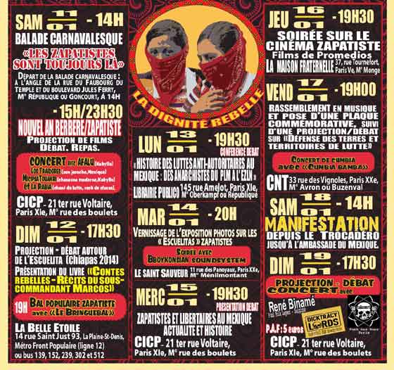 Tamazgha fera donc du 11 janvier 2014 une double célébration : celle du nouvel an amazigh (Yennayer) et le vingtième anniversaire du soulèvement zapatiste. Et c’est naturellement que Tamazgha marque cette date et exprime par la même sa solidarité avec les peuples Chiapas en lutte. Elle propose une journée d’activités à Paris qui sera un moment d’échanges sur les luttes des Imazighen et des Indiens du Chiapas dans une ambiance conviviale et festive.