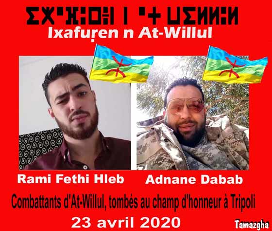 Tamazgha tient à présenter ses condoléances les plus attristées aux familles des deux martyrs ainsi qu’à l’ensemble des combattants amazighs qui se battent contre les Forces armées arabes libyennes de Khalifa Haftar. Nous les assurons de notre soutien total et nous serons à leurs côtés jusqu’à la victoire.