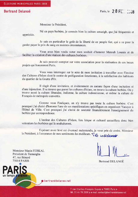Tamazgha s’est exprimée sur des propos qui la dérangent dans un courrier de Delanoë. Elle lui a adressé un courrier. Ce dernier a répondu.
