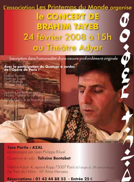 L’association "Les Printemps du Monde" organise, à Paris, un concert avec l’artiste kabyle Brahim Tayeb le 24 février 2008 à 15hoo, au Théâtre Adyar à Paris. En première partie AZAL, avec des chants kabyles anciens.