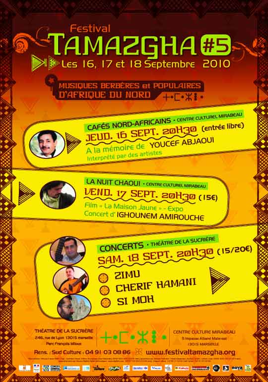 Le Festival Tamazgha est une initiative de l’association SUD CULTURE qui offre un espace dédié au patrimoine musical d’Afrique du nord dans les cadres exceptionnels du Parc François Billoux et du centre culturel Mirabeau à Marseille les 16, 17 et 18 septembre 2010.